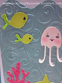The water background was created with Cuttlebug Divine Swirl. I ran it through the Cuttlebug and then added clear embossing powder. It gave it a nice shimmery look.